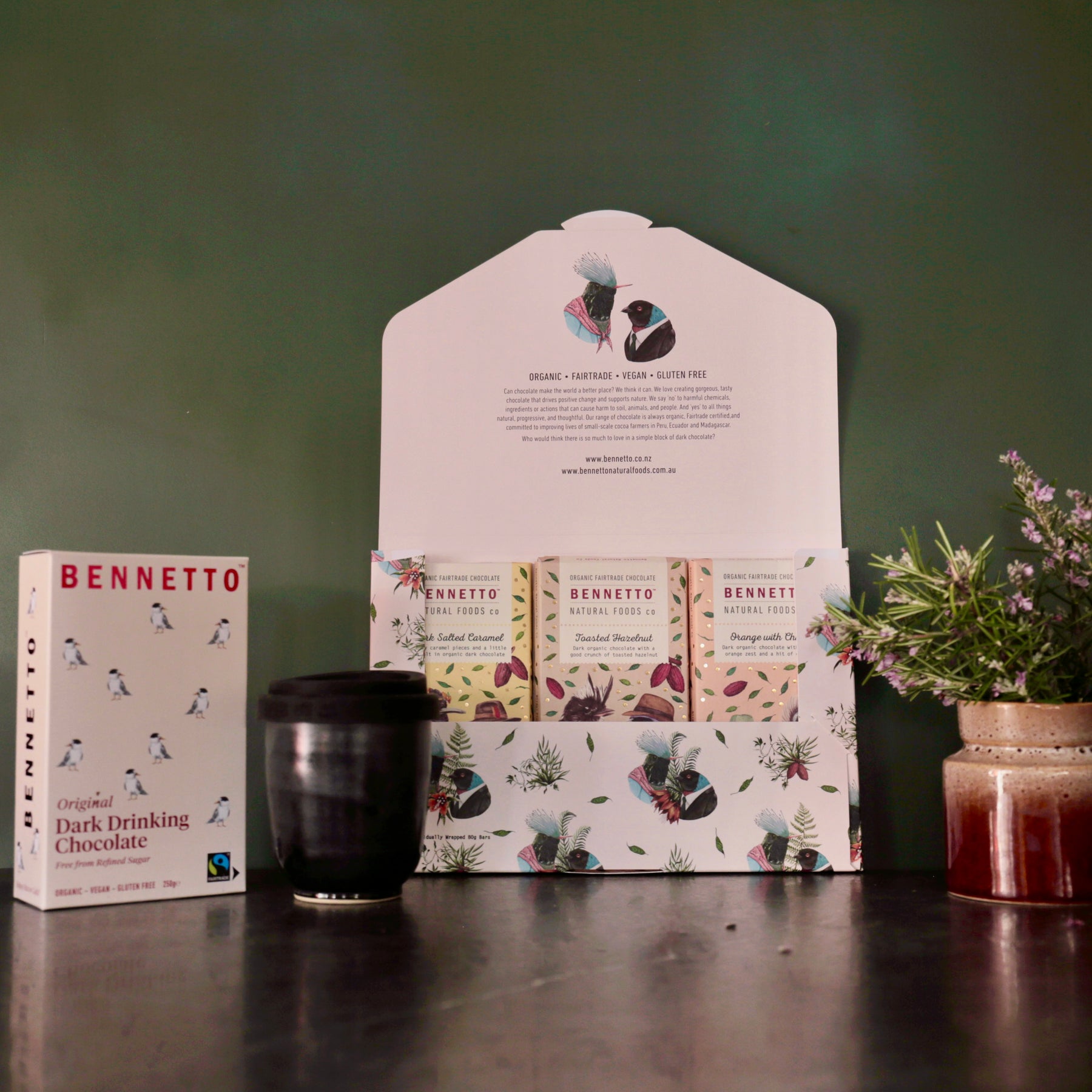Bring a little extra joy to your spring days. This bundle has everything you need: a one-of-a-kind handcrafted mug, silky drinking chocolate (tastes amazing hot or iced), and three of our favourite bars to snack, share, or gift. Perfect for fresh mornings, catch-ups with friends, or a little “just for me” moment.